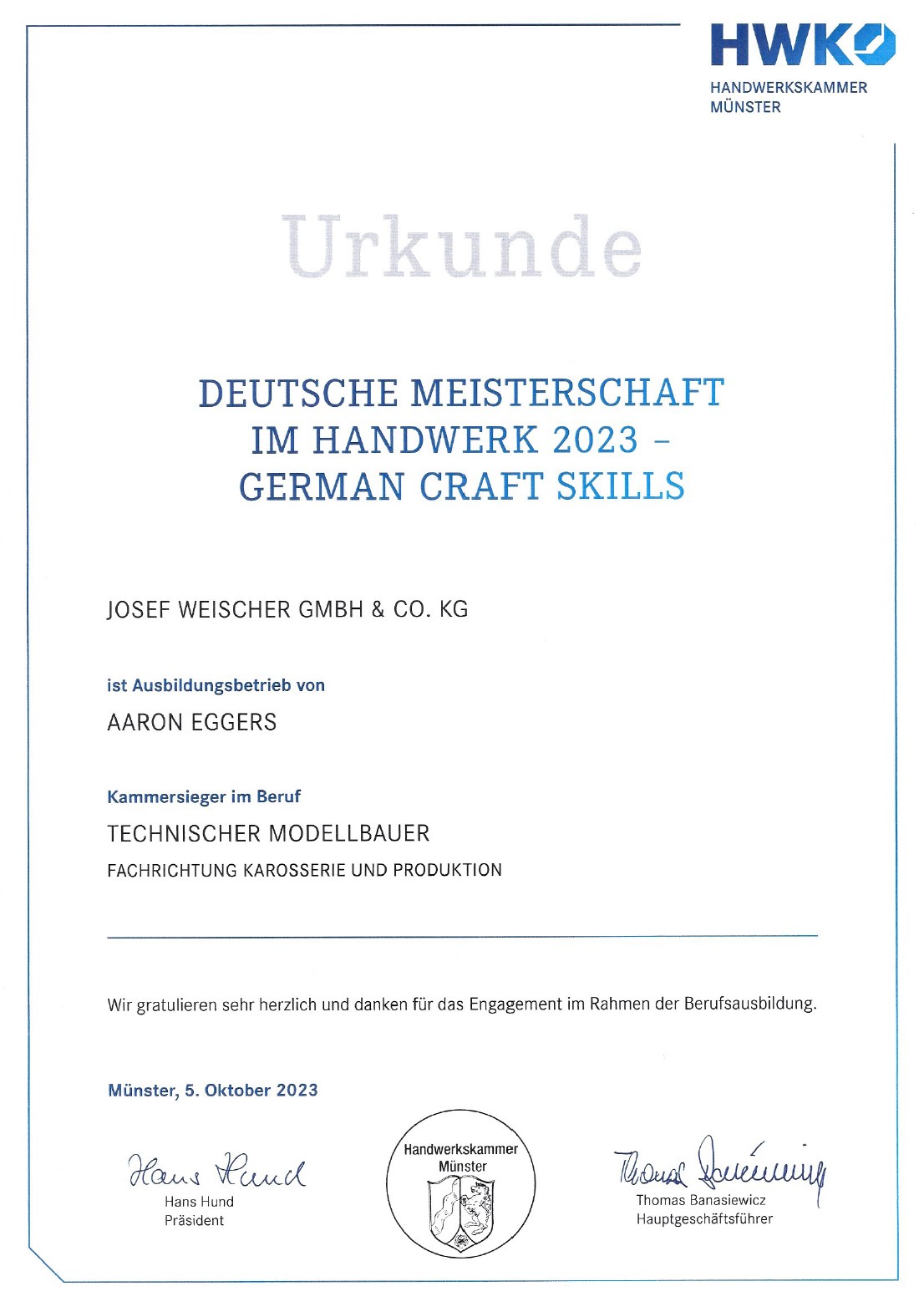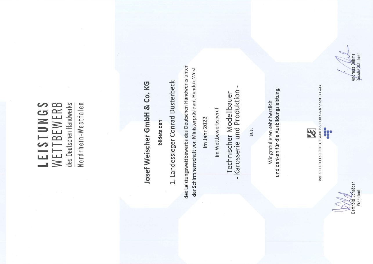 Die Josef Weischer GmbH & Co.KG bildete mit Conrad Düsterbeck den 1. Landessieger des Leistungswettbewerbs des Deutschen Handwerks im Wettbewerbsberuf: